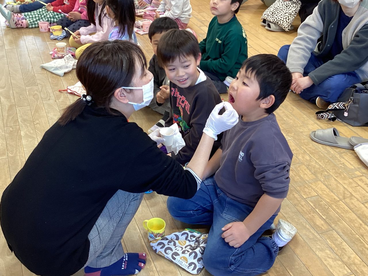 その後、保健センター、歯科衛生士さんによるブラッシング指導がありました。