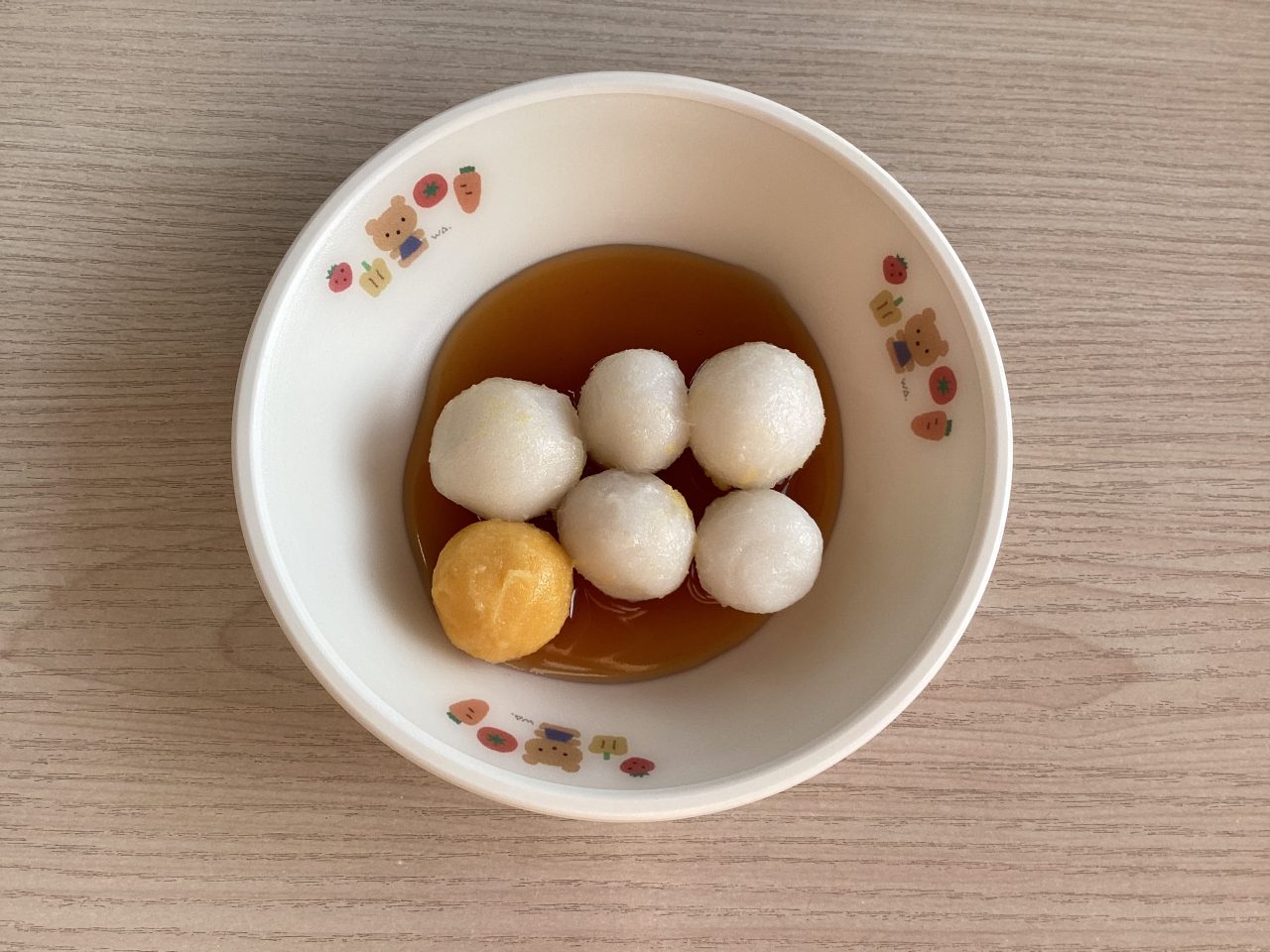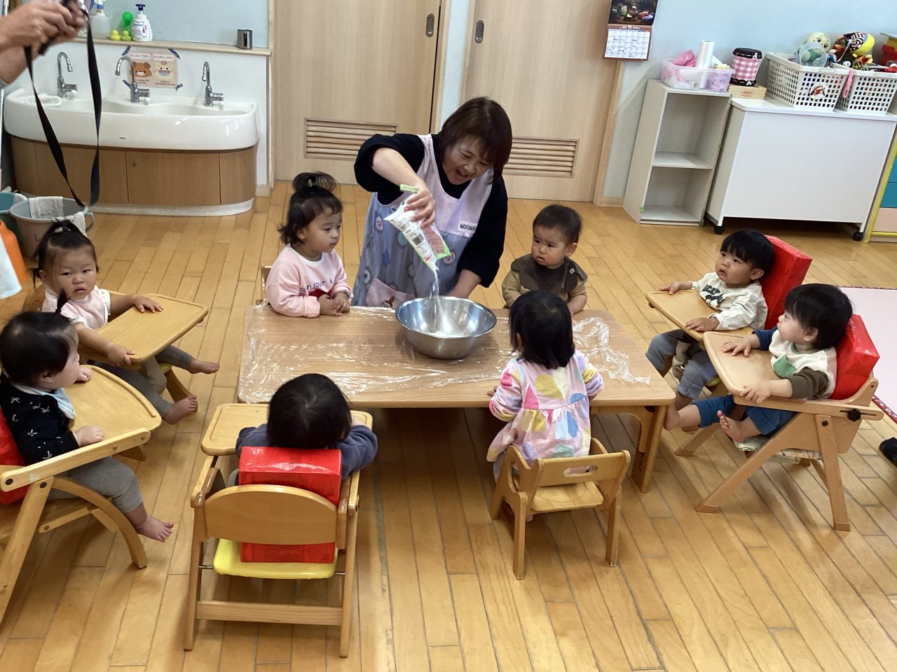 それぞれのクラスでお団子作りをしました。お団子の粉(サラサラ)にお湯を入れ