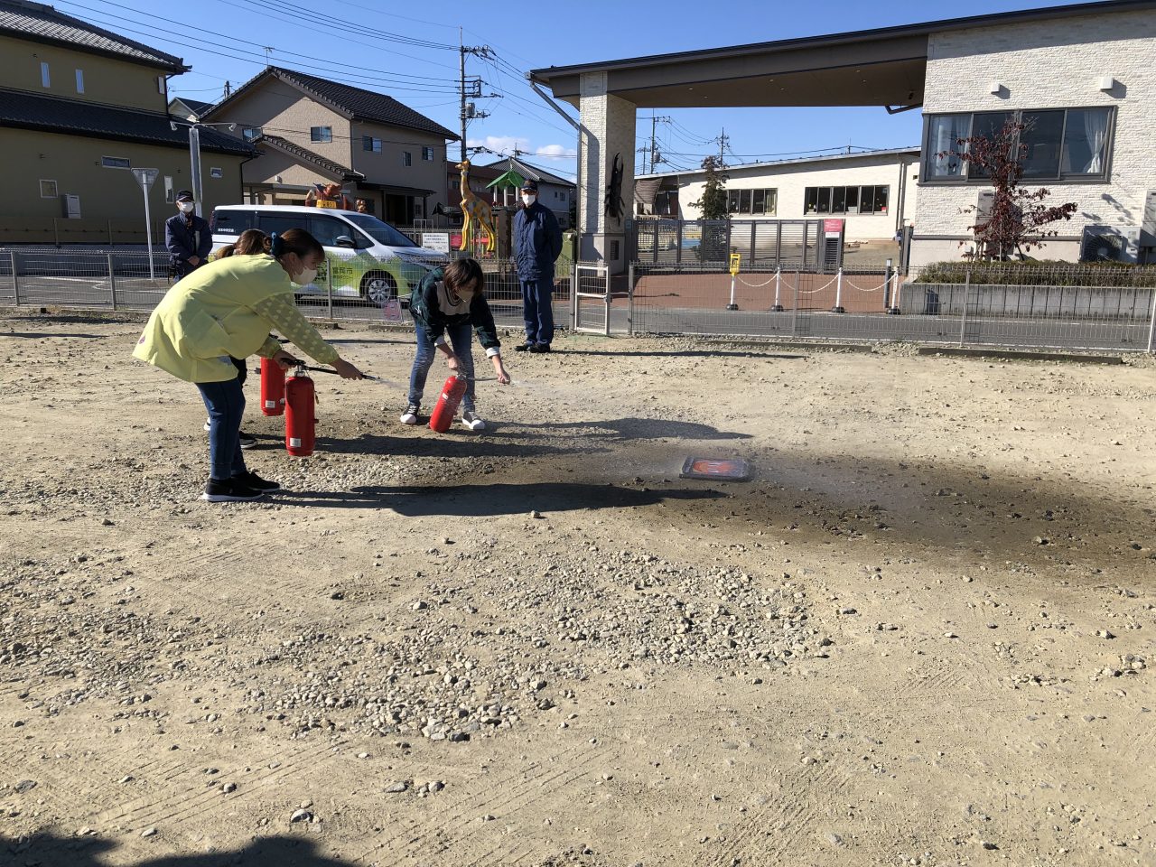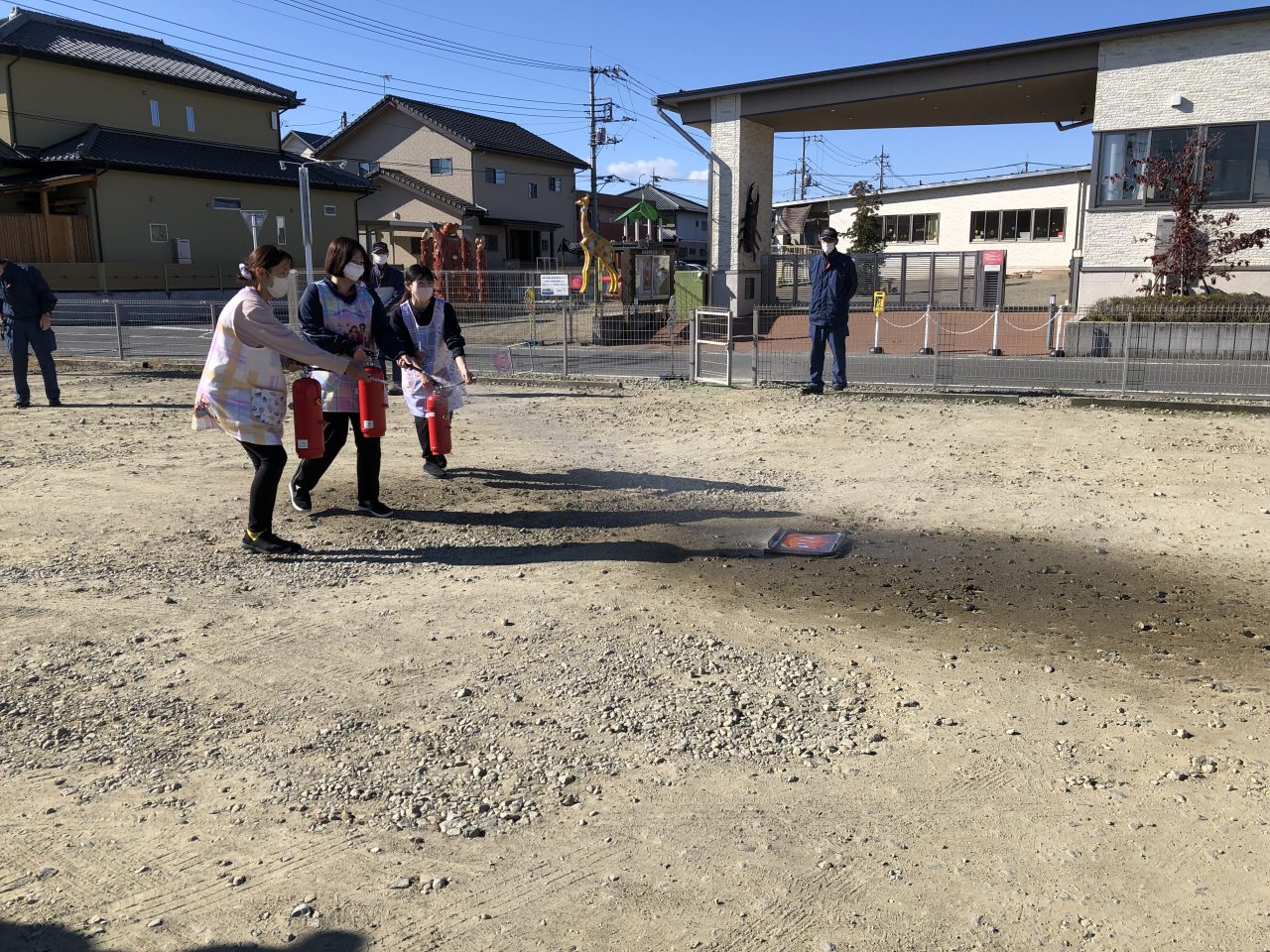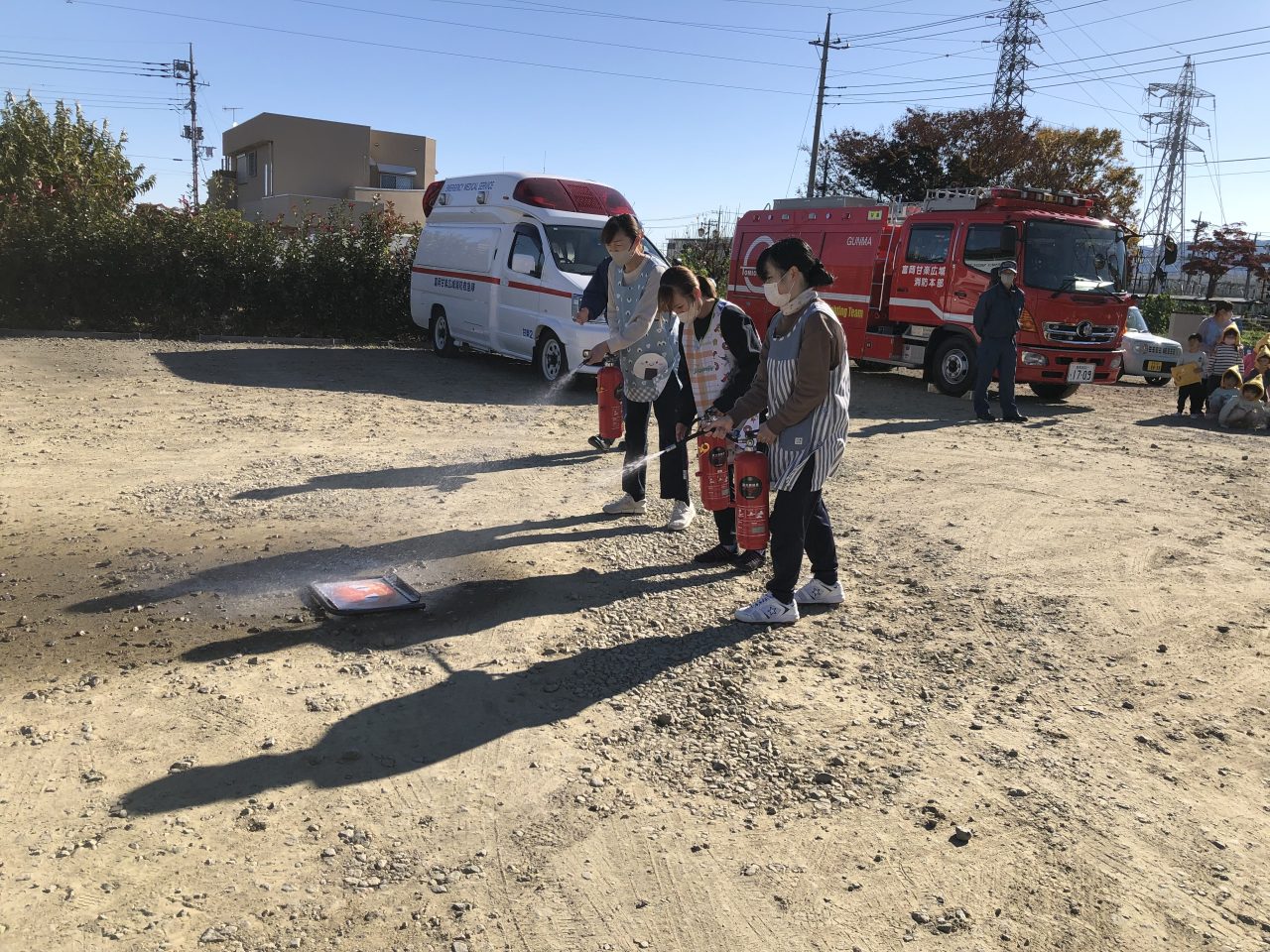 職員の消火訓練もみんなで見て応援をしていました。無事に炎のパネルが倒れると