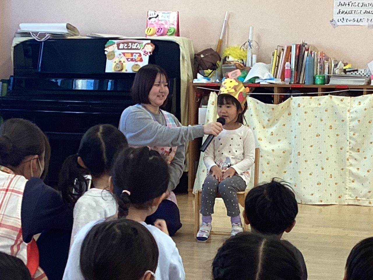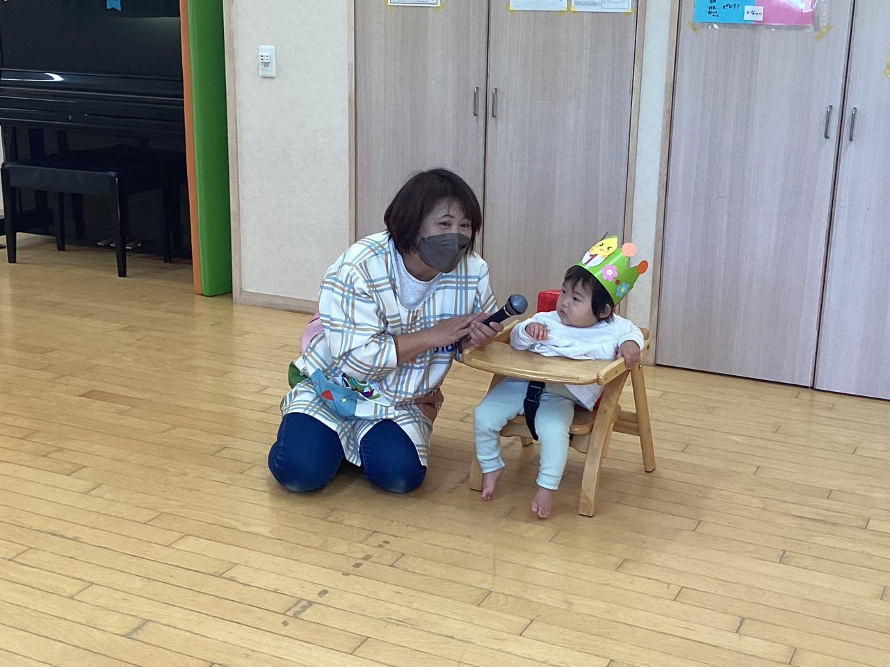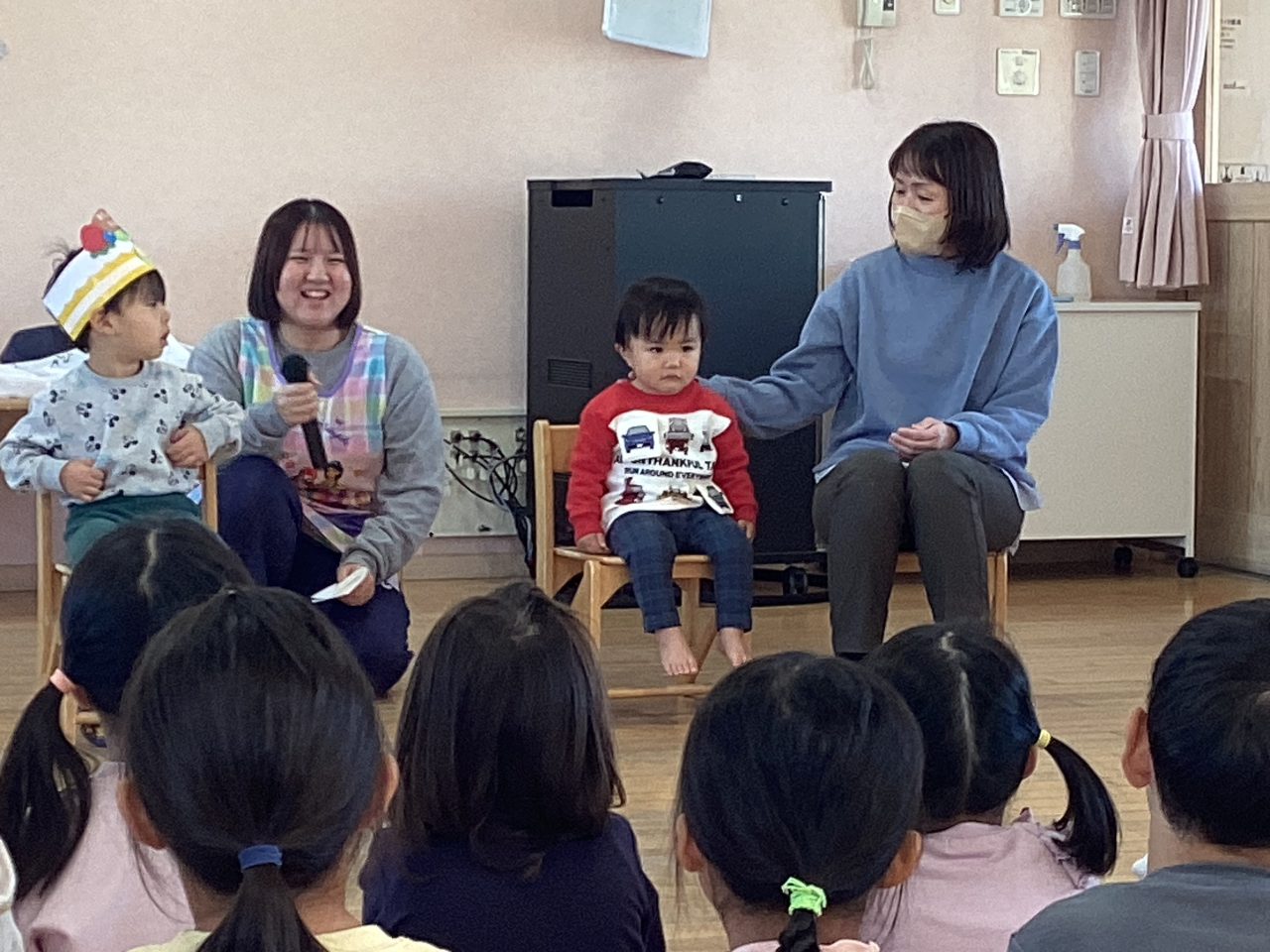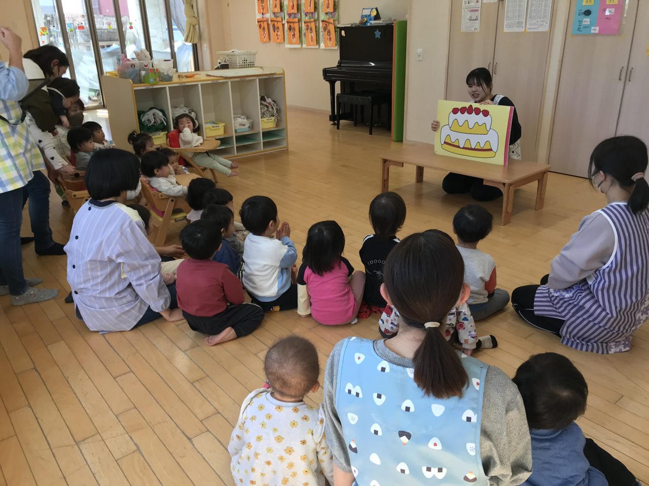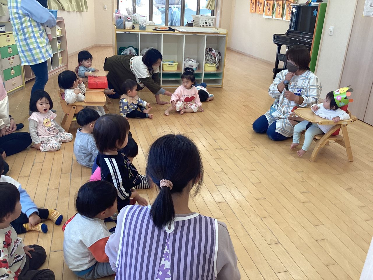 11月のお誕生会です。未満児は2名(1名は欠席)以上児は3名、支援センターに来ているお友だち1名でお祝いをしました。