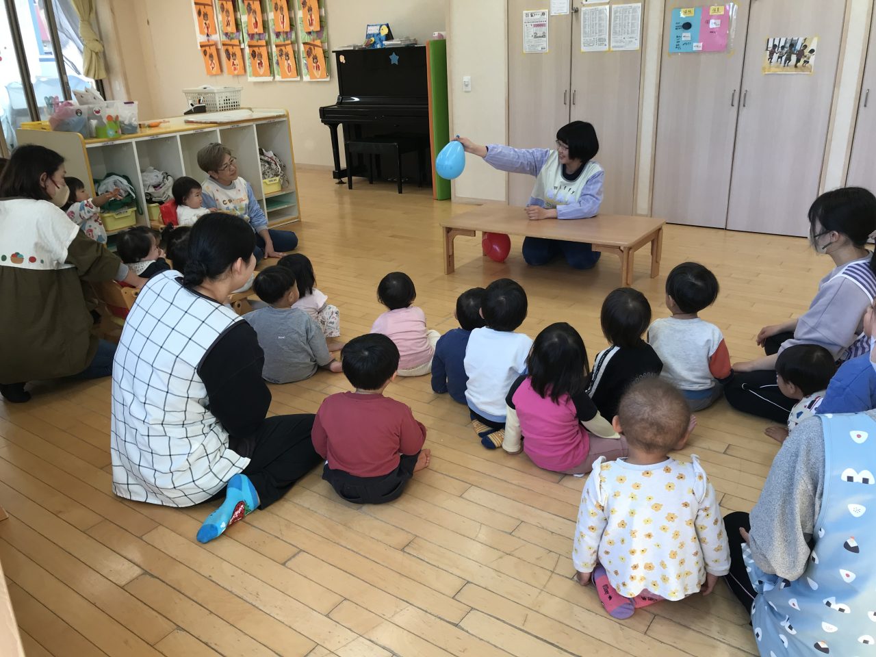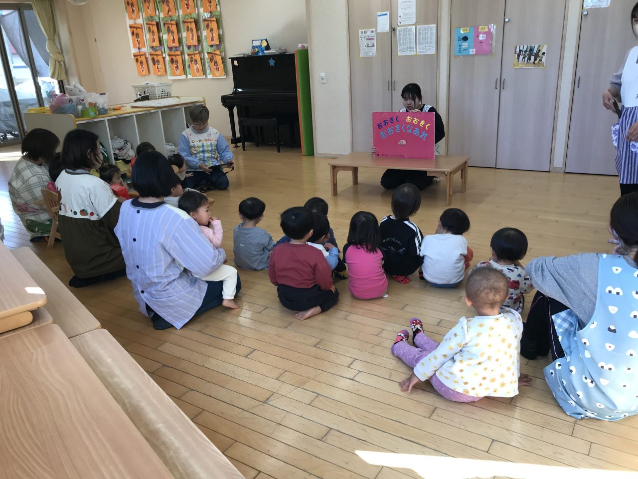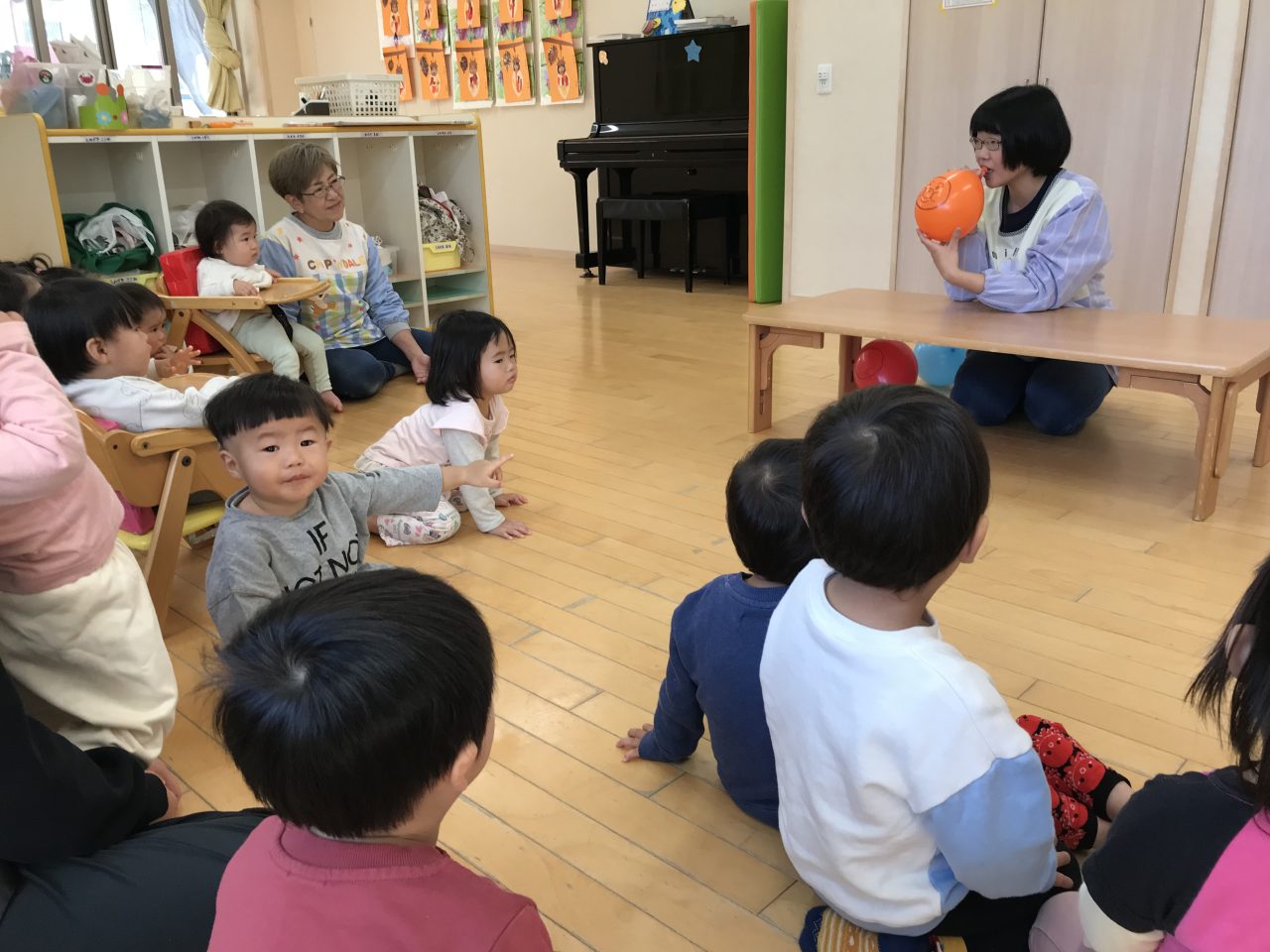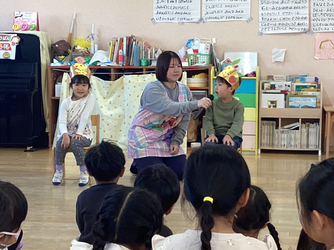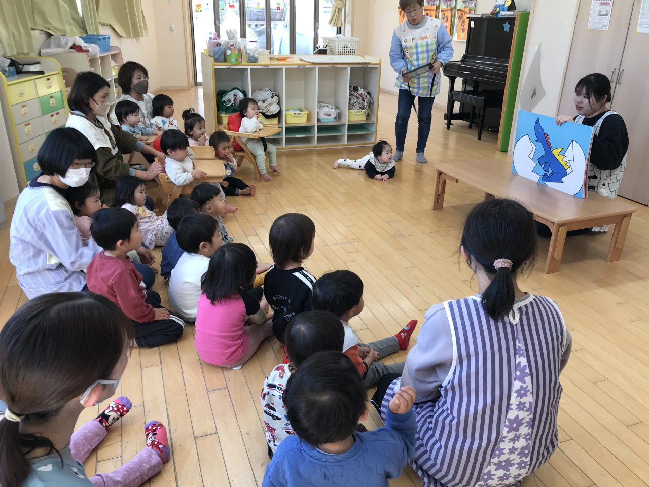 11月のお誕生会です。未満児は2名(1名は欠席)以上児は3名、支援センターに来ているお友だち1名でお祝いをしました。