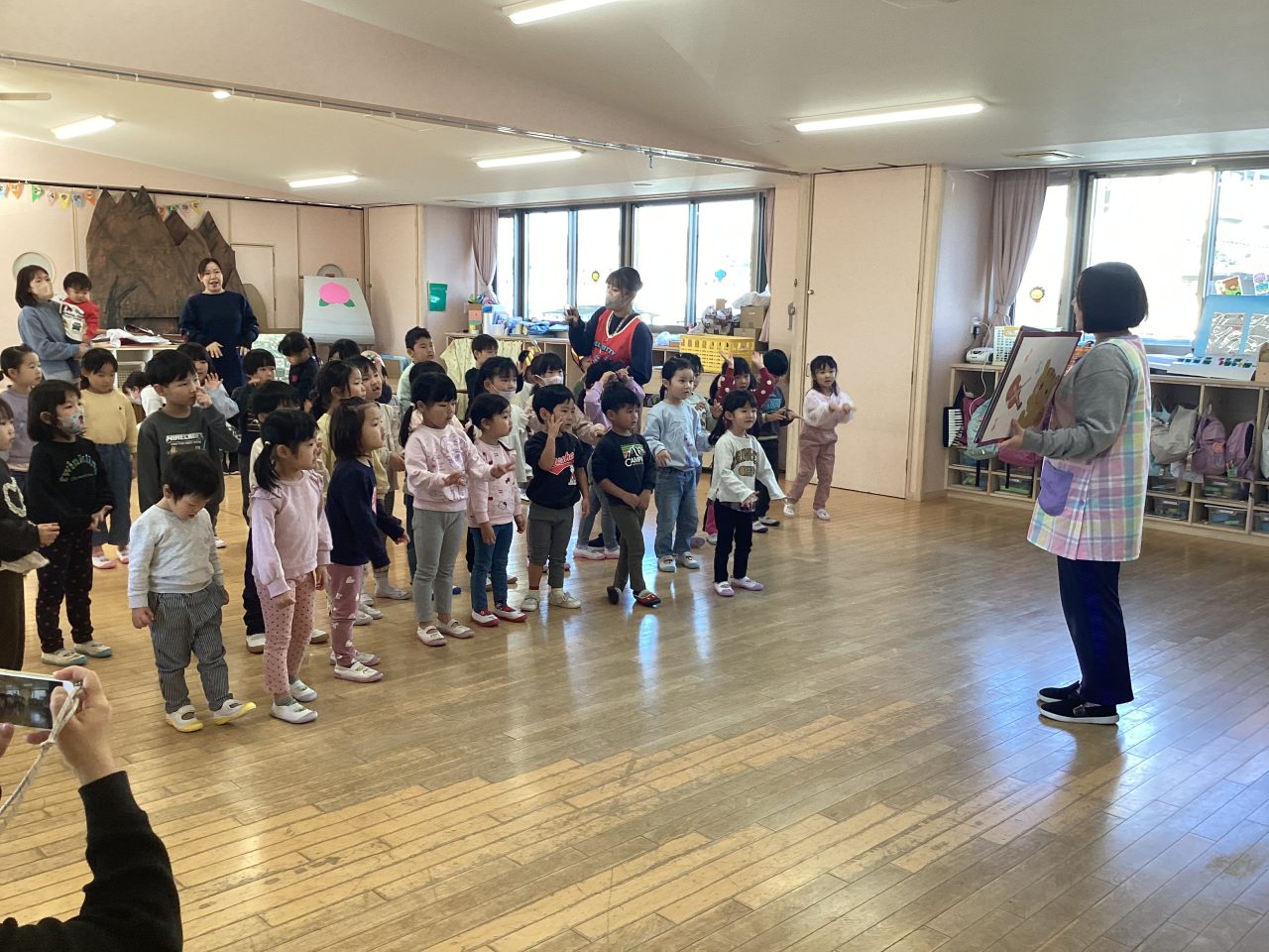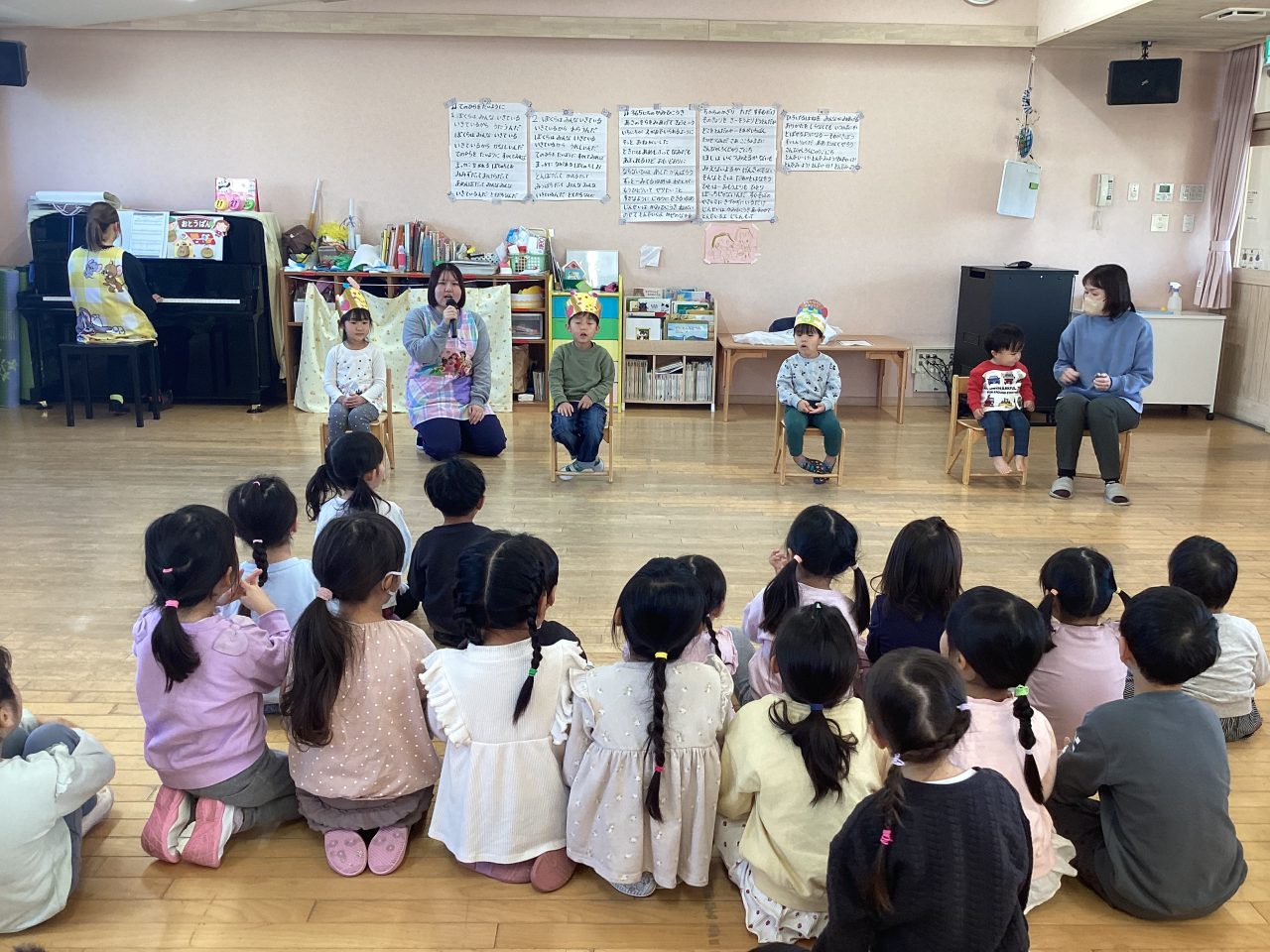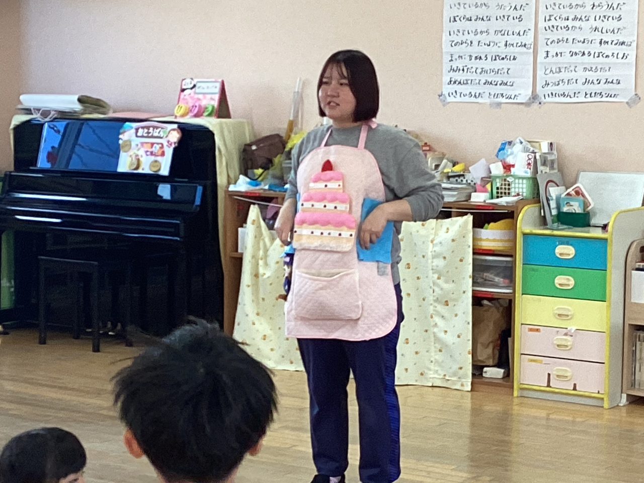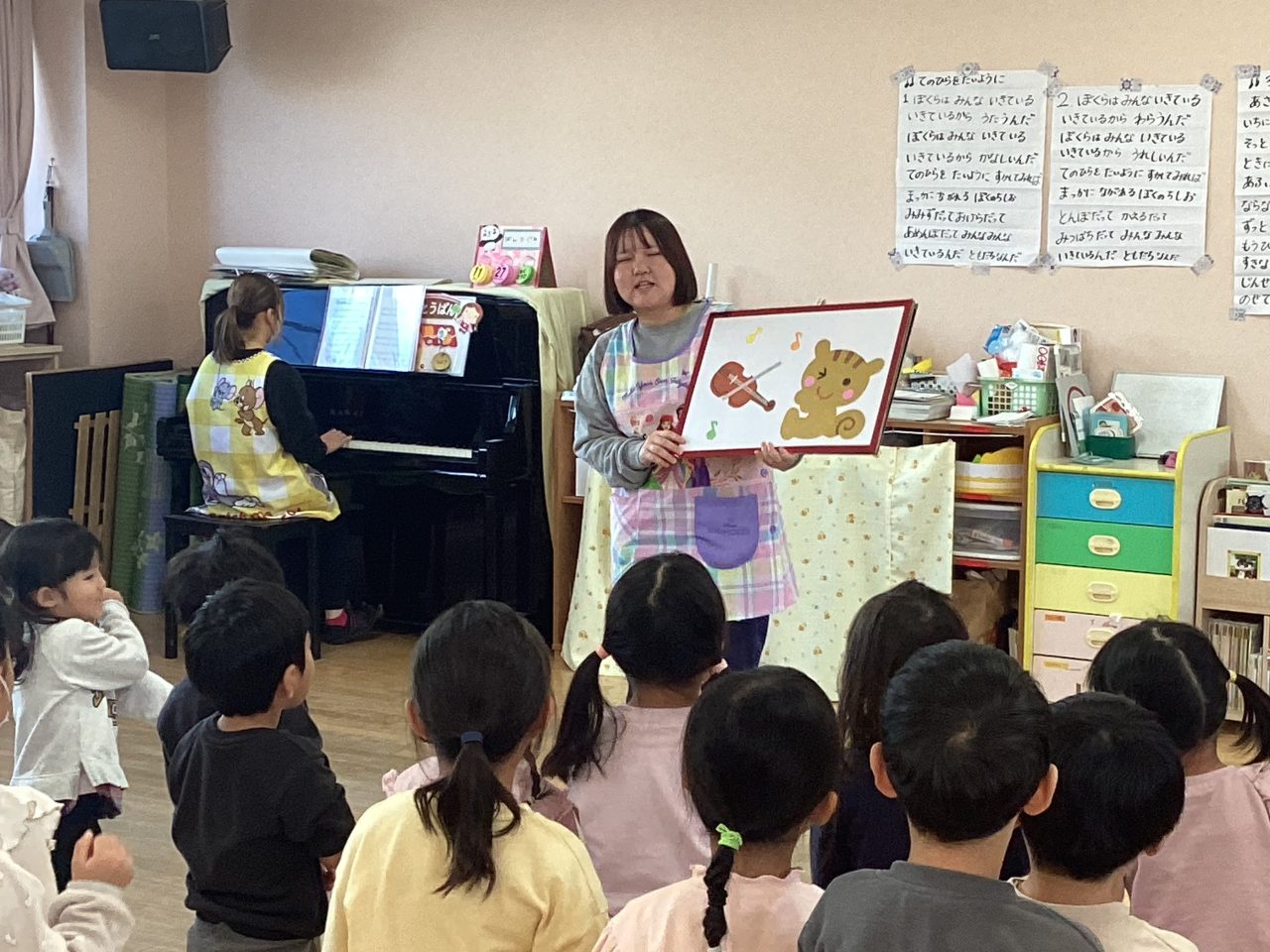 以上児は【歌 山の音楽隊】【エプロンシアター  なぞなぞ誕生会】