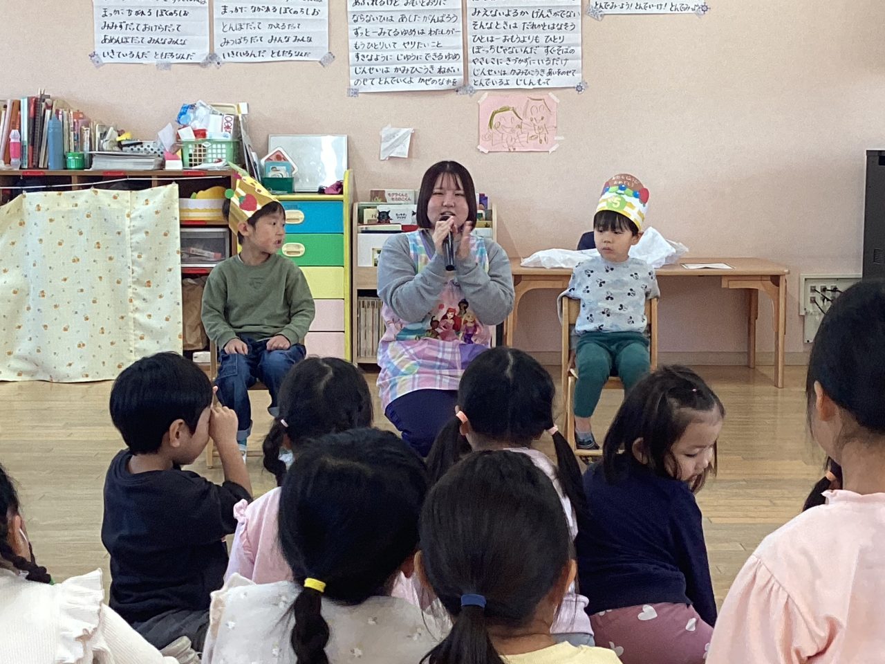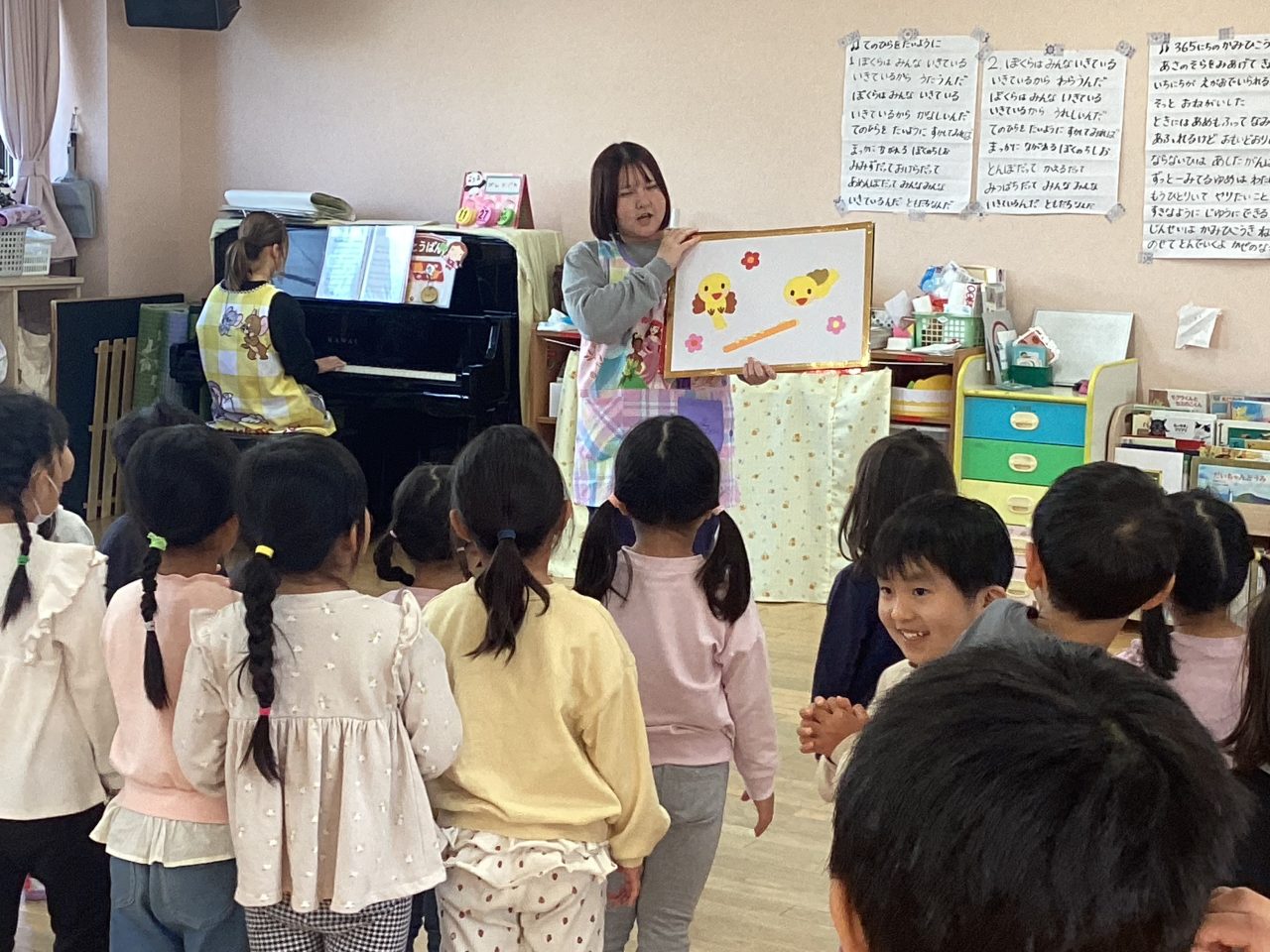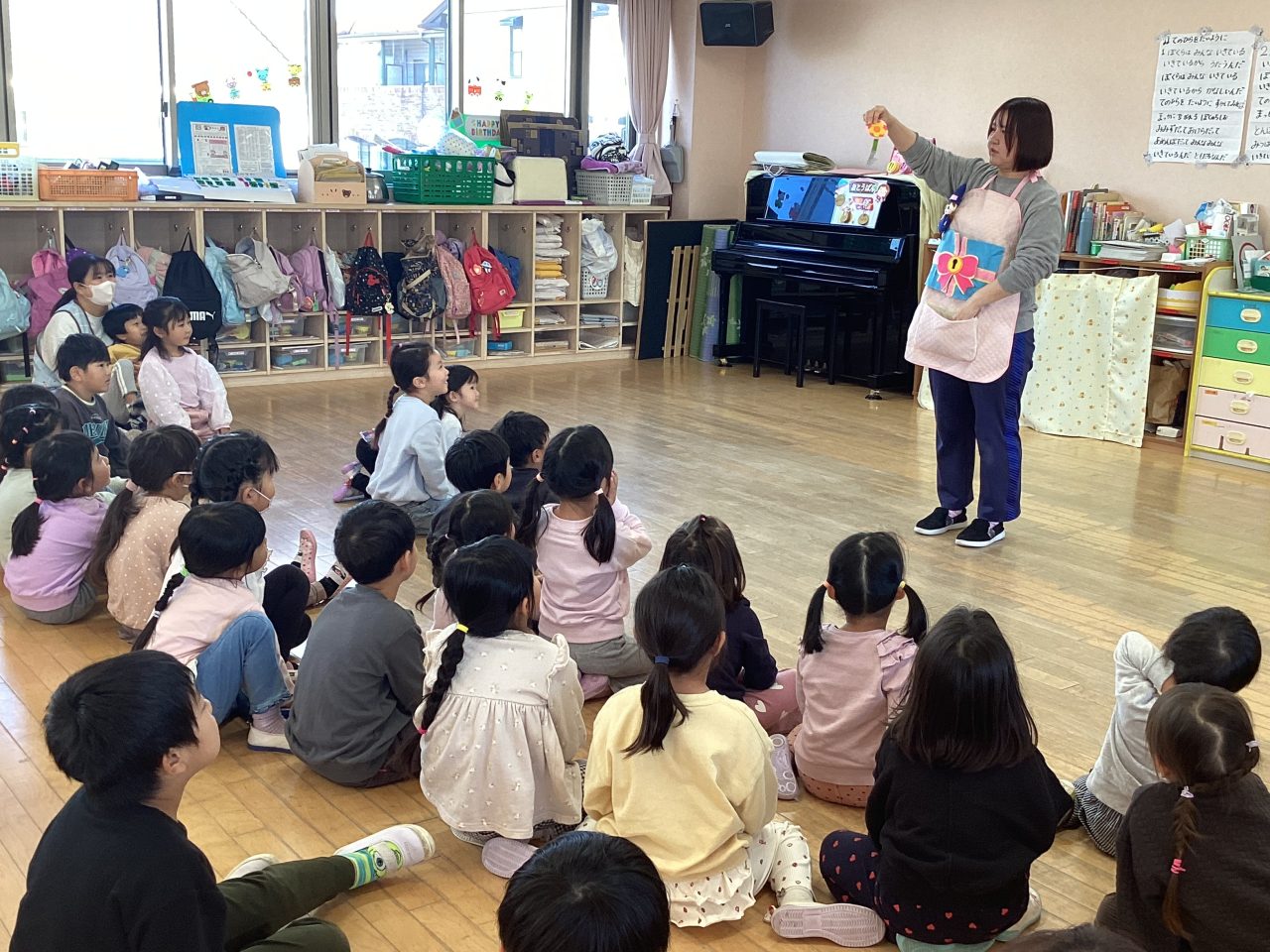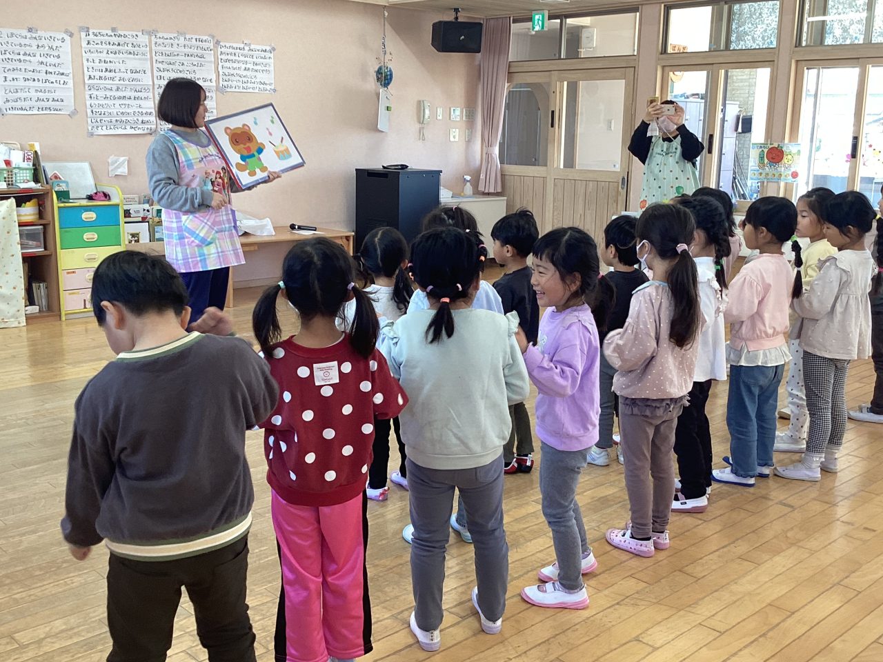 以上児は【歌 山の音楽隊】【エプロンシアター  なぞなぞ誕生会】